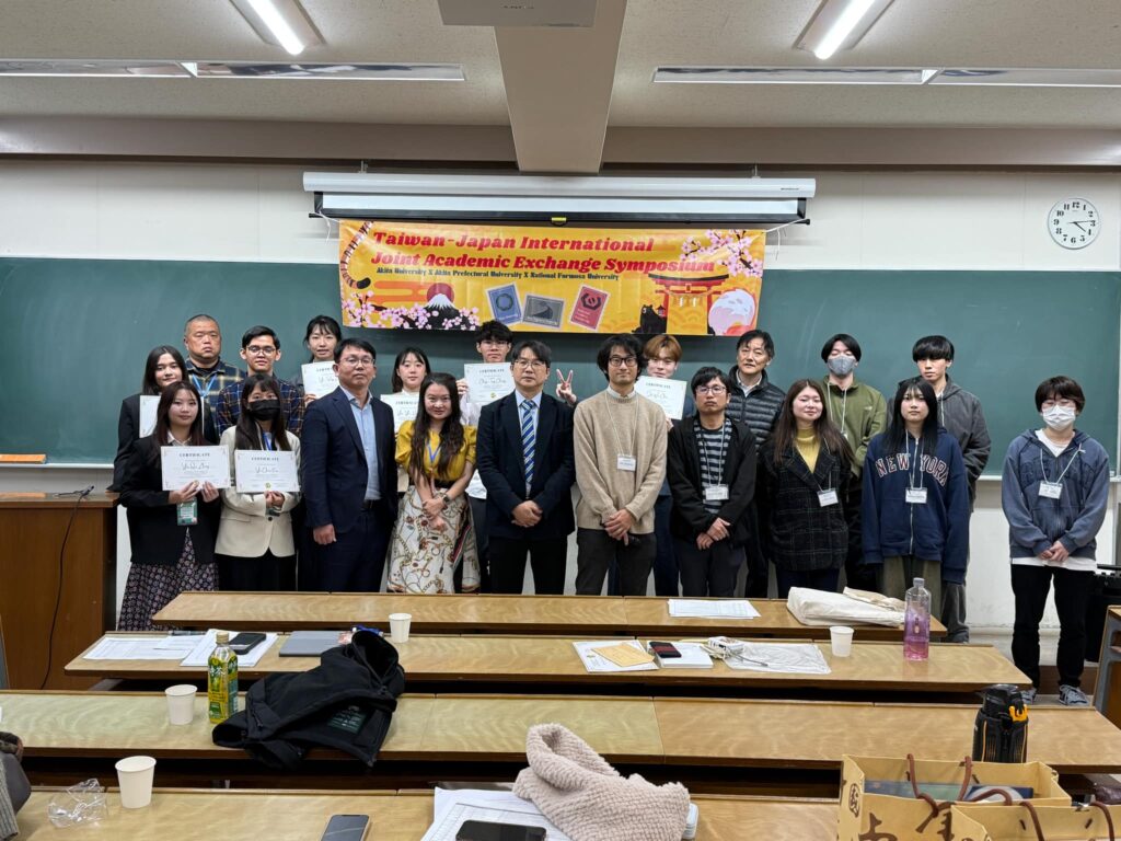 2025年12月11日、台湾の国立虎尾科技大学から学生・教員の計12名が研究室を訪れ、秋田県立大学の荒井健一先生と共に虎尾科技大学ー秋田県立大学ー秋田大学の合同シンポジウムを行いました。